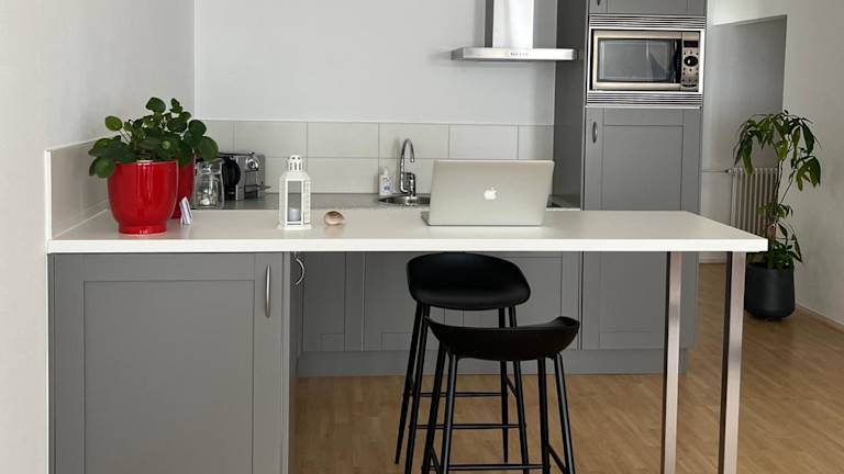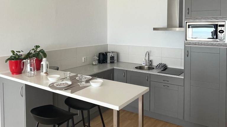 Die Ferienwohnung umfasst zwei Schlafzimmer, ein Badezimmer sowie einen Essbereich und eine voll ausgestattete Küche. Zur Ausstattung gehören Bettwäsche, Handtücher und ein Flachbild-TV. Der Balkon bietet einen Blick auf das Meer, jedoch ist der kleine Seitenbalkon derzeit aus Sicherheitsgründen nicht zugänglich.