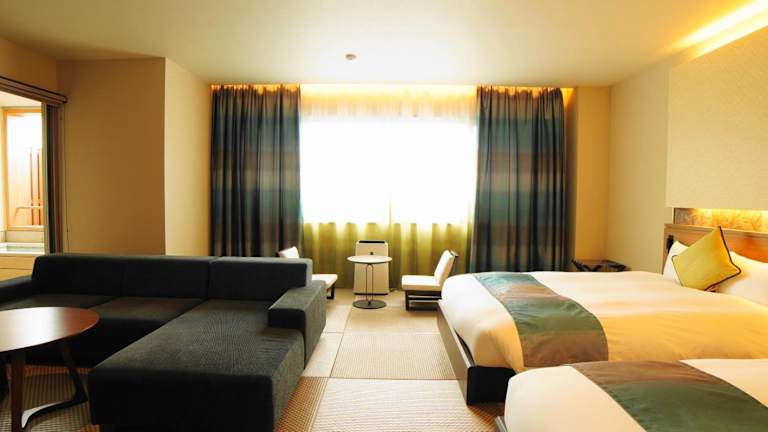 Die Zimmer im Riraku Ryokan sind mit einem Wasserkocher ausgestattet und bieten modernen Komfort. Jedes Zimmer verfügt über einen Schreibtisch, einen Flachbild-TV und ein eigenes Bad. Genießen Sie den Blick auf die umliegende Landschaft und entspannen Sie sich in Ihrem gemütlichen Zimmer.