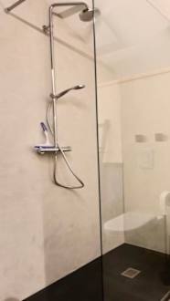 Ebenerdige Dusche mit Regendusche und Mobile.