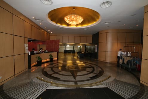 Das Foyer des Hotels mit Rezeption (links), Gepäckaufbewahrung (rechts) und Sitzmöglichkeiten weiter hinten, von wo man zum Aufzug, Restaurant und zur Bar gelangen kann.