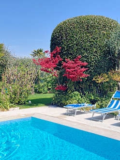 Mit Blick in den Garten und den dahinter liegenden Olivenhain