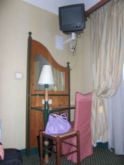 ZimmerBlick vom Bett zum Fernseher und Kommode, rechts das große Fenster.