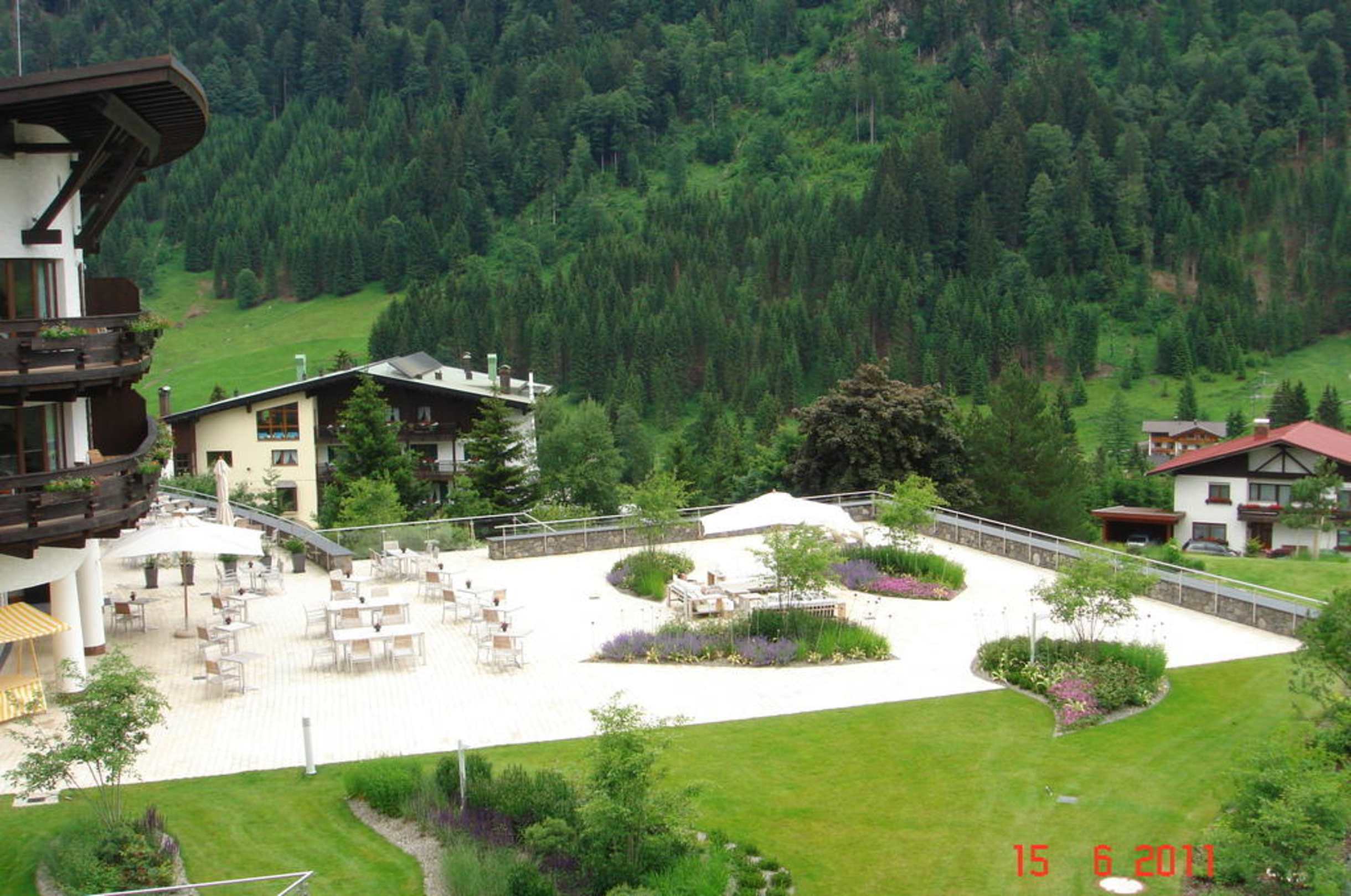 Blick vom Zimmer auf Terasse und das neu errichtete Stammhaus des Hotels