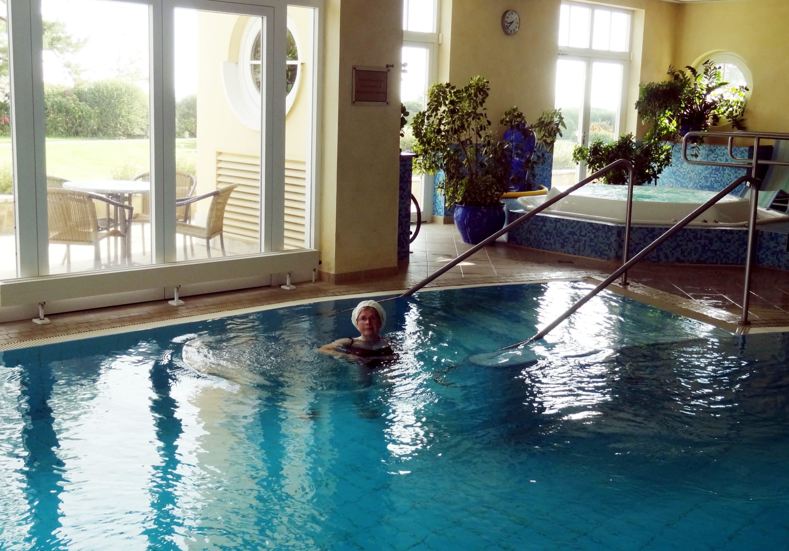 Vom beheizten Innenpool kann man direkt nach draussen in den Aussenpool schwimmen. Auch gibt es einen Wirlpool. Liegen laden zum Verweilen ein.