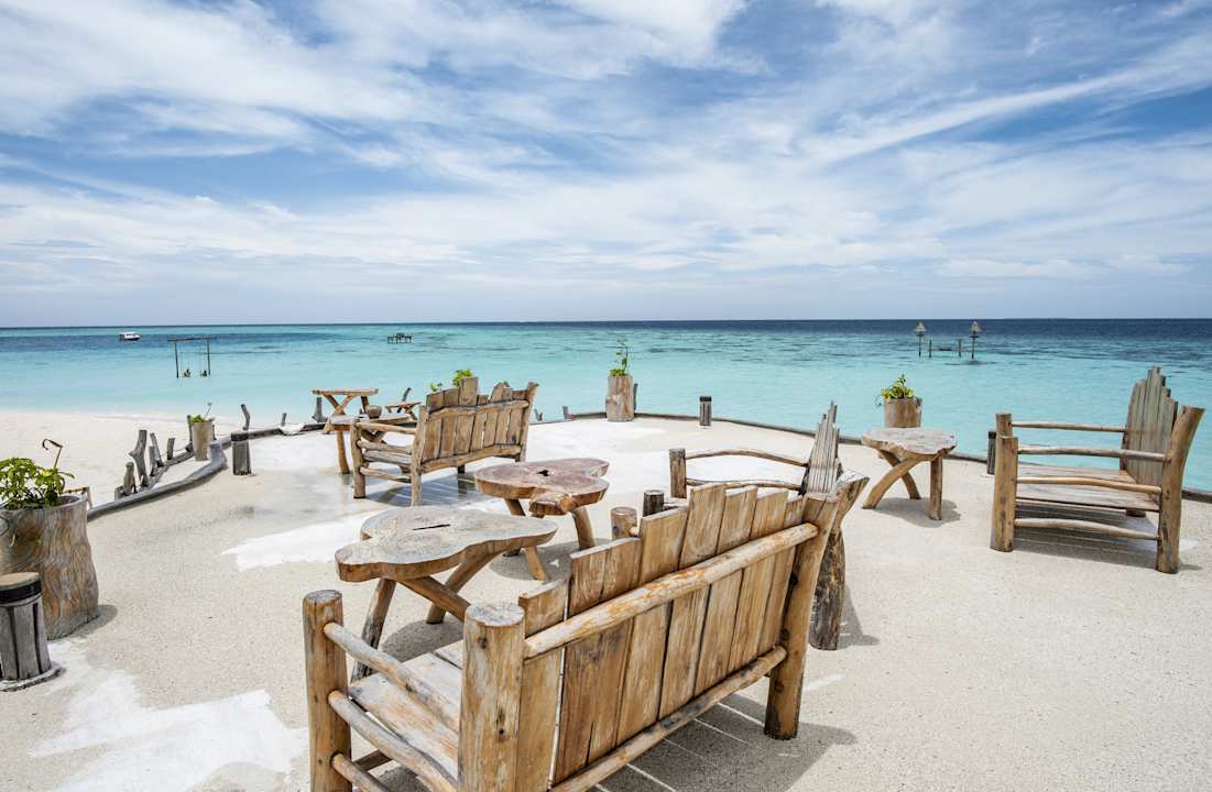 Strandbar mit Sundeck. Von hier kann man tolle Sonnenuntergänge sehen.