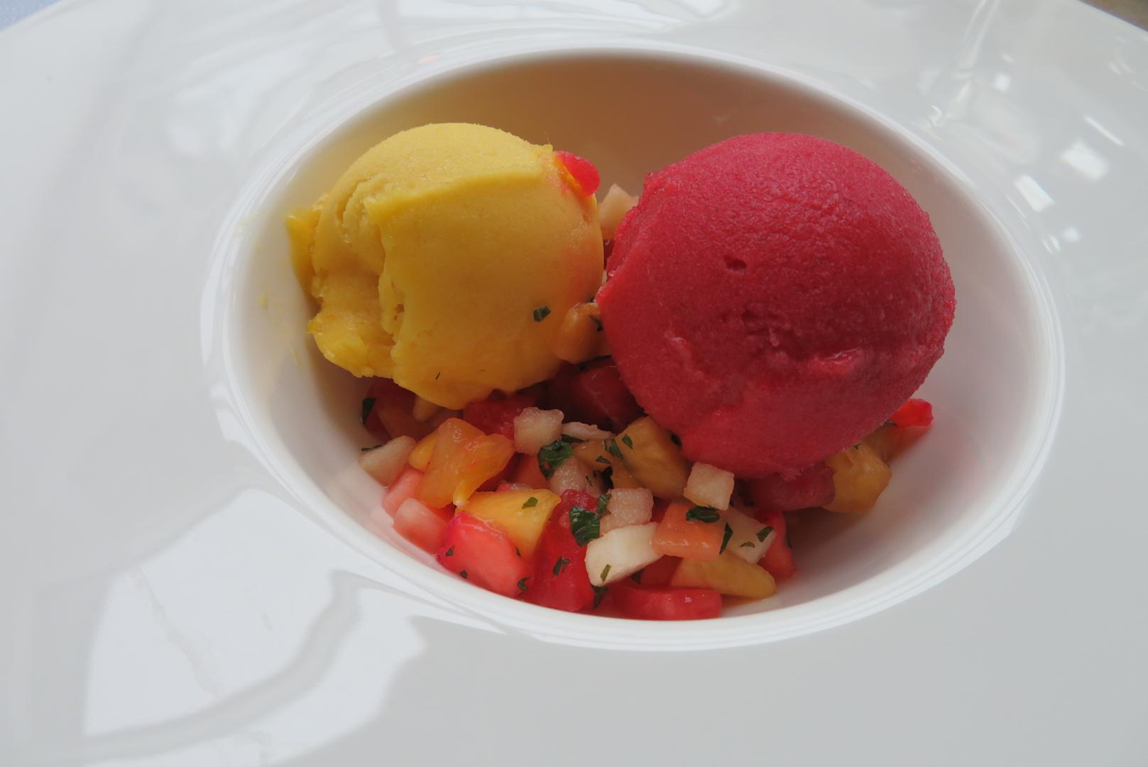 Zweierlei Sorbet mit Obstsalat