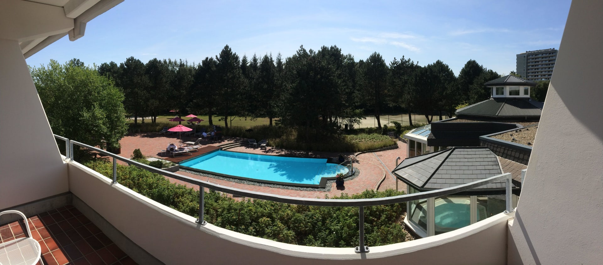 Balkonblick auf den Pool – rechts ist Wellnessoase