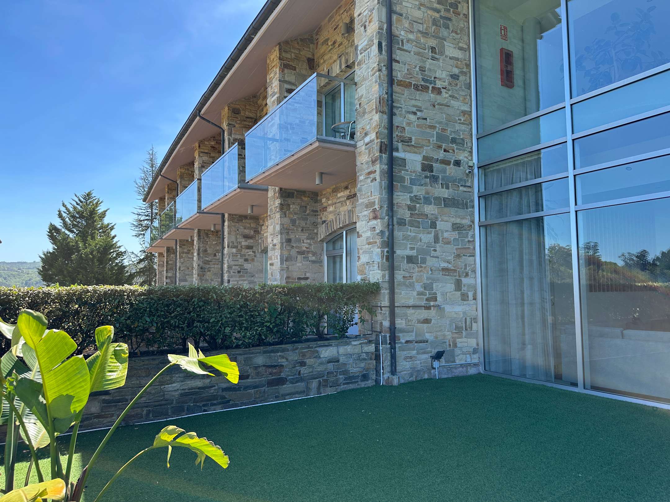 AußenansichtHotel von der Terrasse aus fotografiert. Die Balkone haben einen angenehmen Blick auf das Gelände des ehemaligen Golfplatzes.