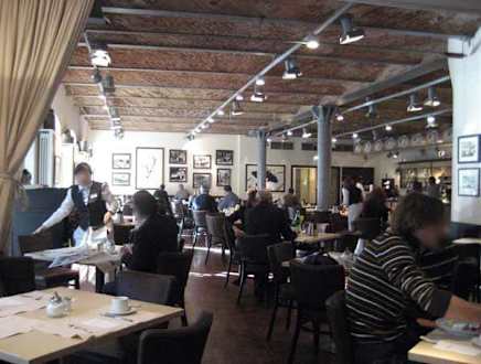 Der große FrühstücksraumDr Frühstrücksraum liegt in einer ehemaligen Speicherhalle der Meierei Bolle. Er ist hell und geräumig.