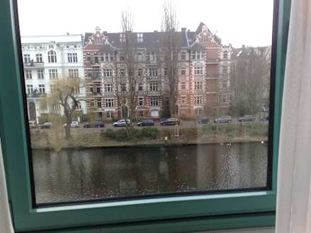 Blick durch Zimmer-Frontscheiben auf d. Spree