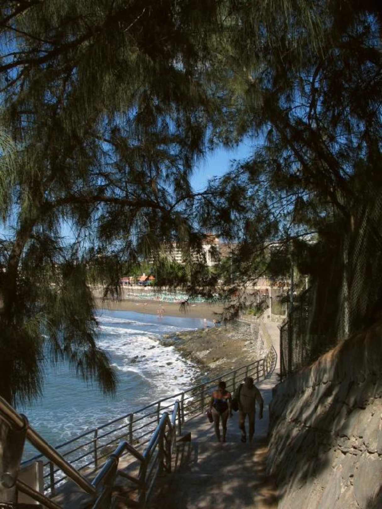 Treppe zum StrandUnten angekommen hat man einen schönen Überblick über den Strand. Durch die Äste Verdeckt ist das IFA Beach Hotel zu sehen.