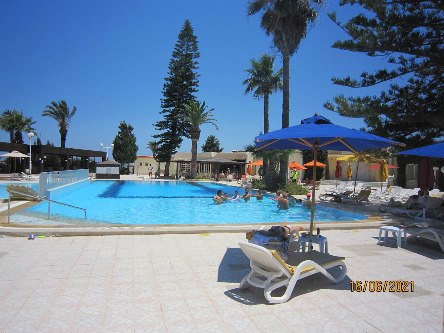 im Hintergrund Poolbar mit Essbereich