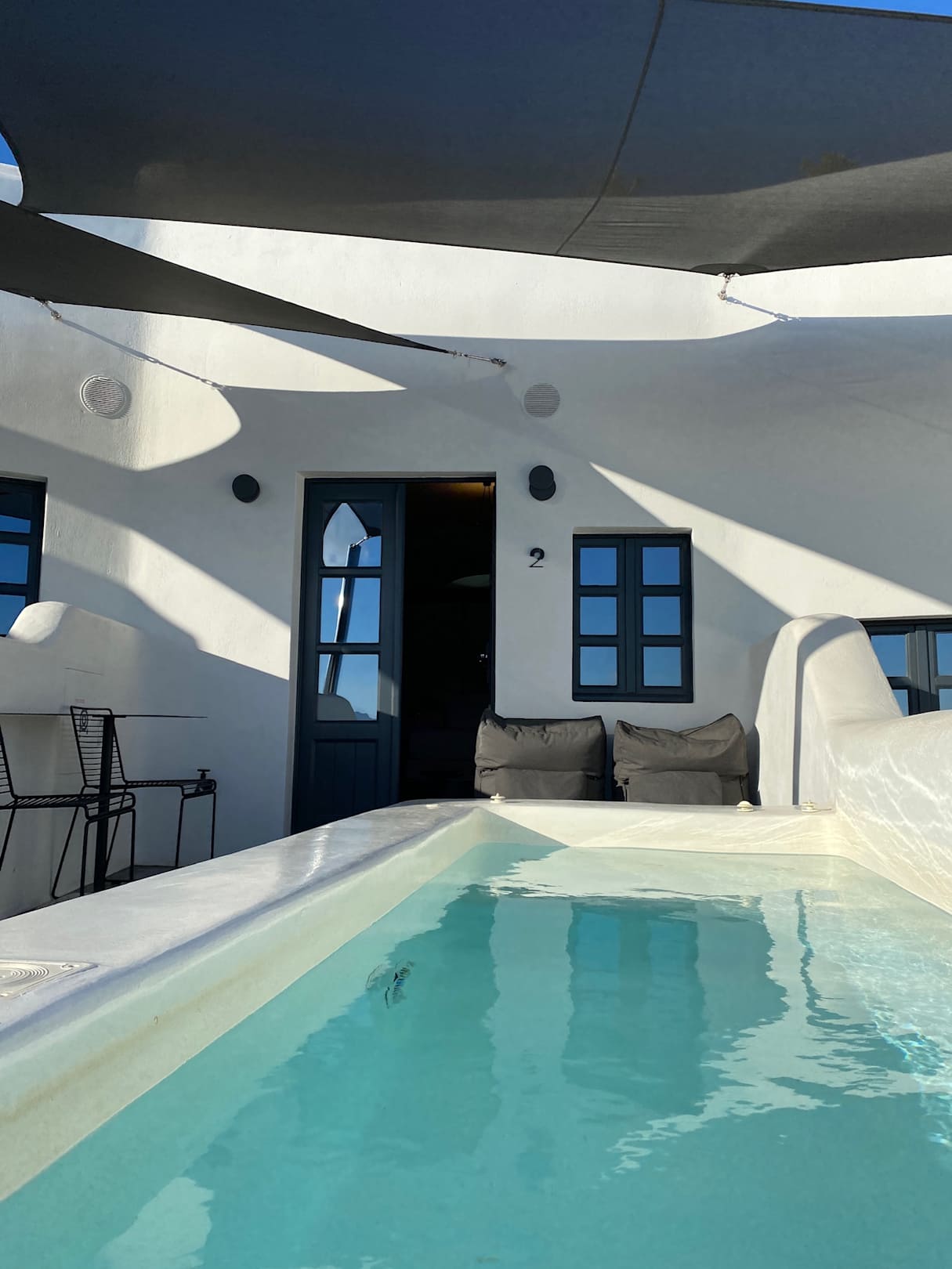 Jedes Zimmer hat einen kleinen whirlpool. An dem kleinen Tisch wird morgens das Frühstück serviert.