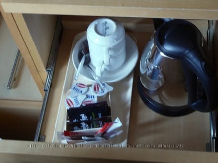 ZimmerElektrowasserkocher, Kaffeegeschirr und Instant-Tütchen für Kaffee, Milchpackungen für eine Tasse in einer Schublade vorhanden.