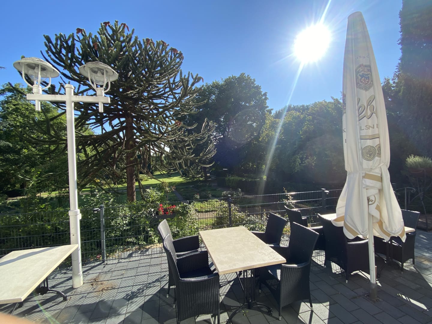 Blick vom Restaurant über die Terrasse in den Park