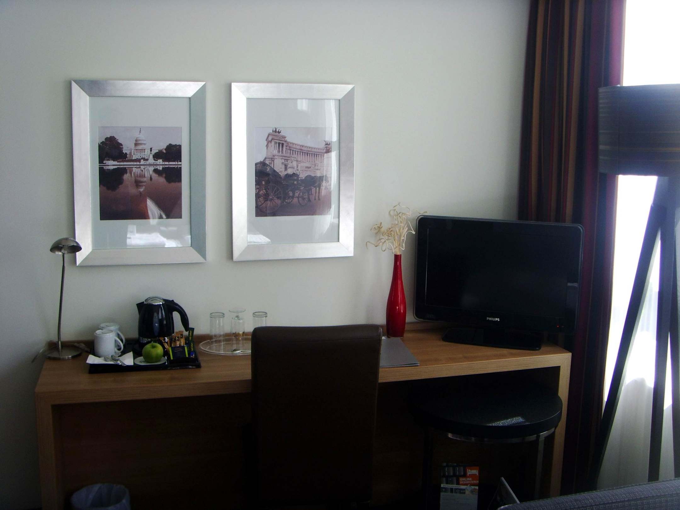 Schreibtisch mit TV, Wasserkocher usw.