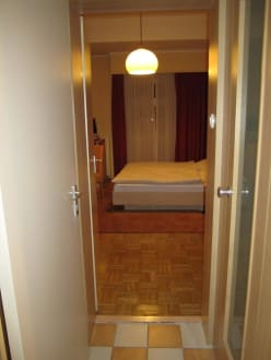 Eingang ins ZimmerMan betritt das Zimmer, rechts geht die Tür zum WC ab und links hinter der Zimmertür verbirgt sich die Dusche.