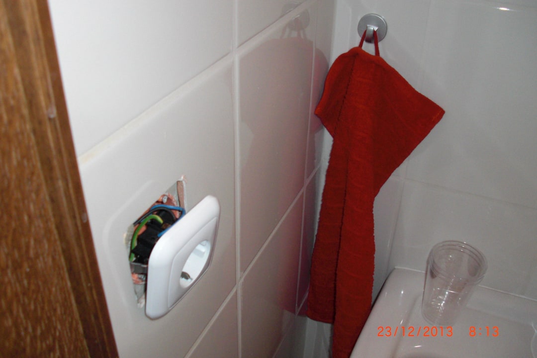 Der einzige Haken mit einem Mini-Gästehandtuch für 3 Personen (+3 Duschtücher). Steckdose die beim herausziehen des Steckers aus der Wand kommt = tolle Qualität!