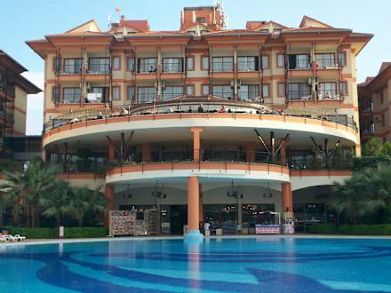 Pool mit Blick auf das HaupthausDas Haupthaus; unten Pool mit Tatoo, Fotograf, 1, Etage Eingang zum Haupthaus, 2. Etage Bar, darüber Zimmer