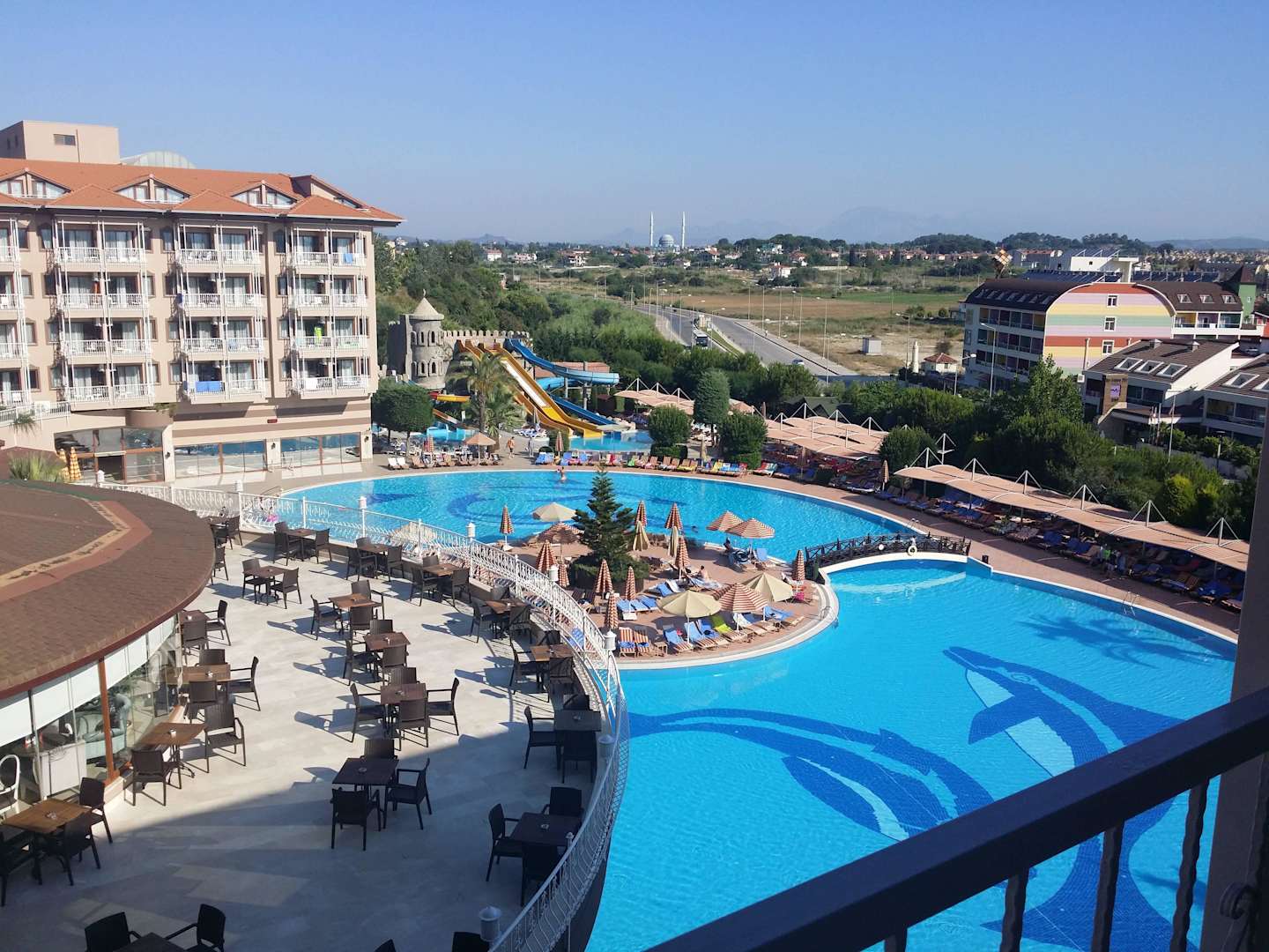 Blick von der Terrasse auf den Pool