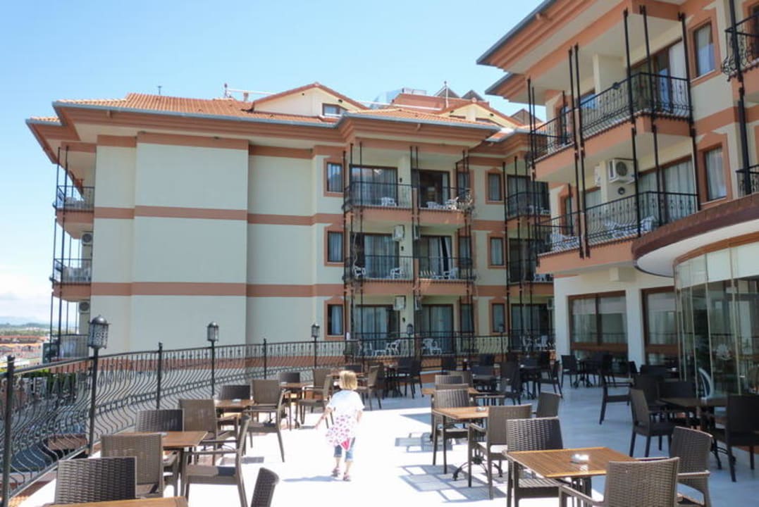 Terrasse der Lobby mit Aussicht auf den Pool