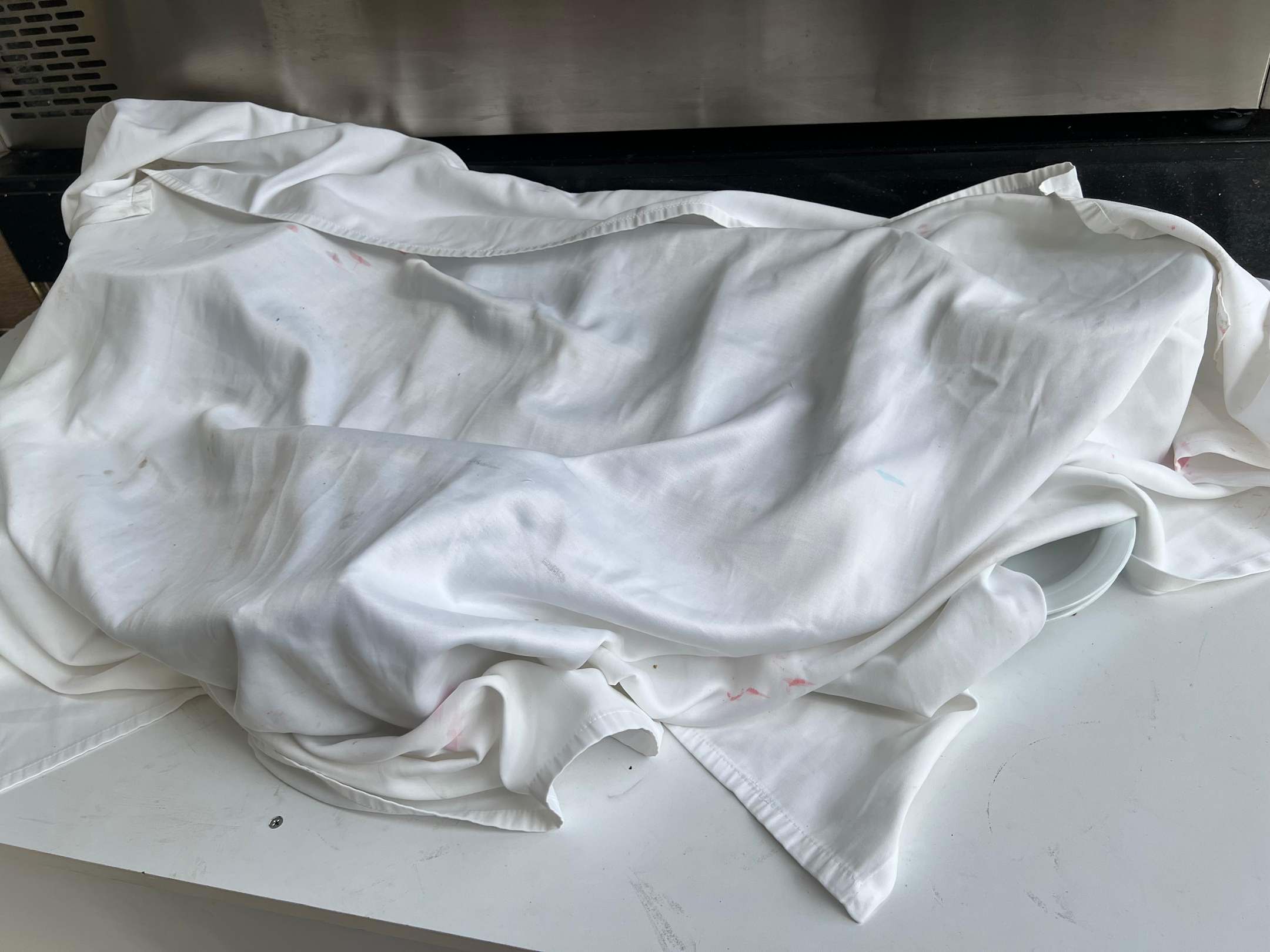 Teller werden mit dreckigen Tüchern abgedeckt