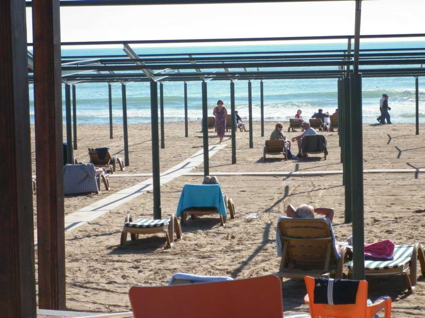 Hotel-Strand mit Blick auf Meer.