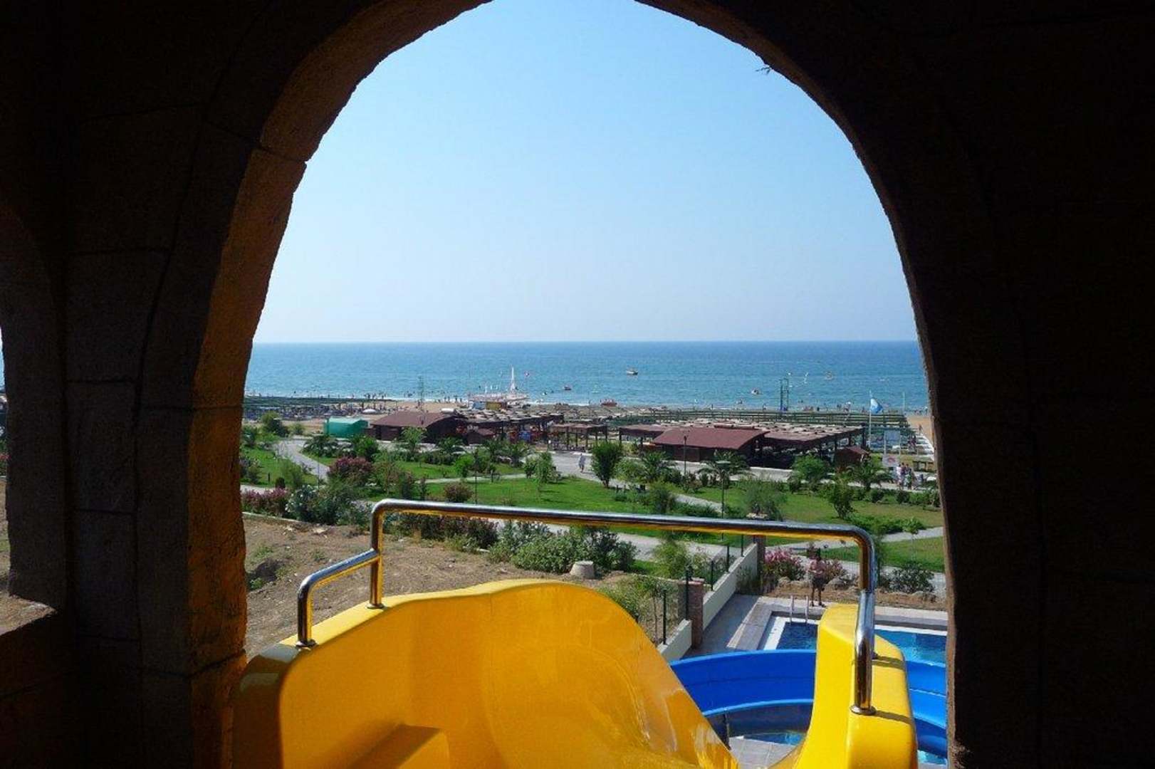 Beachbar und Strand von der Rutsche aus