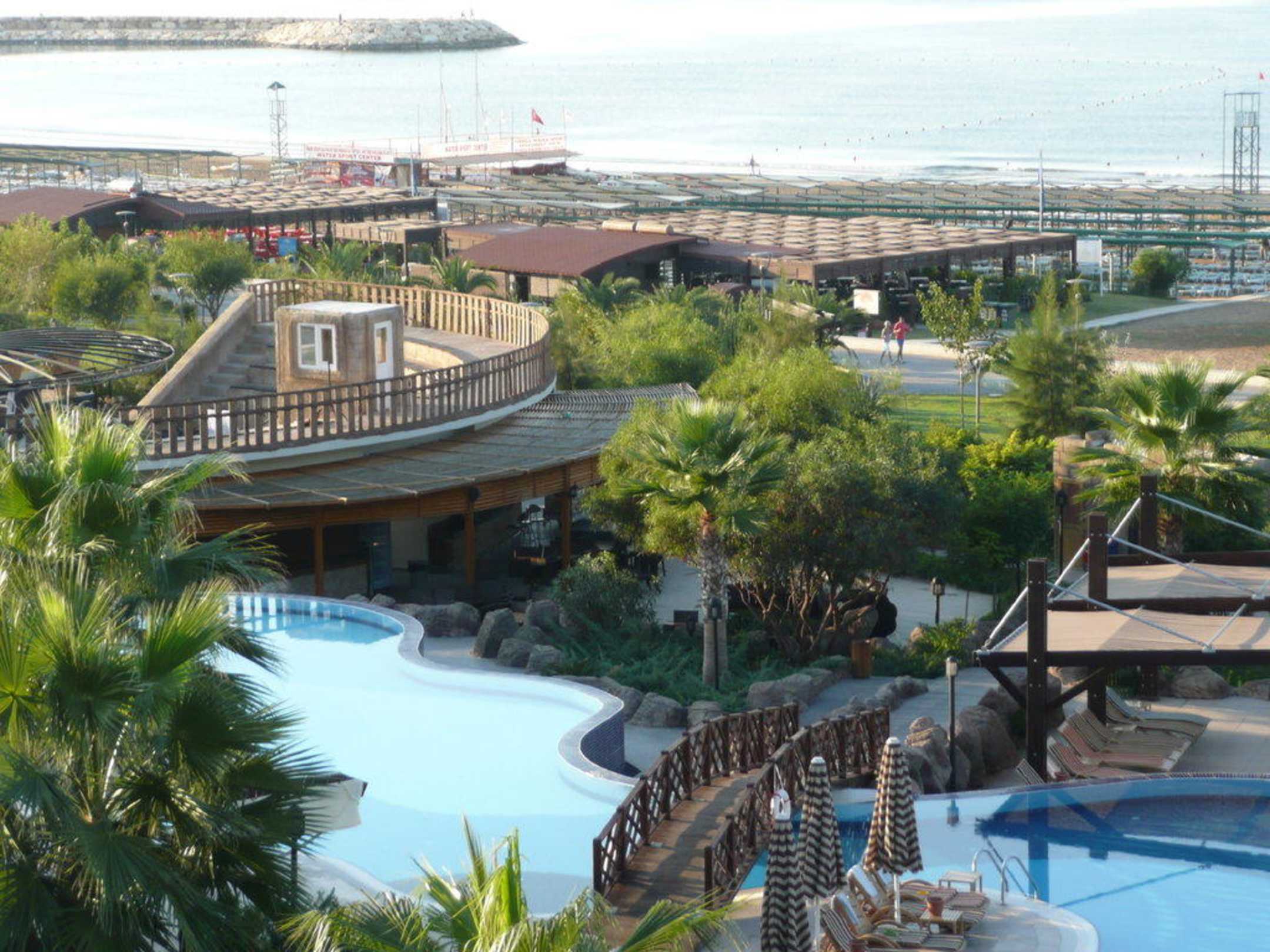 Blick auf die parkähnliche Poolanlage