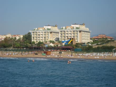 vom neuen Hafen Ausblick auf Strand und Hotel