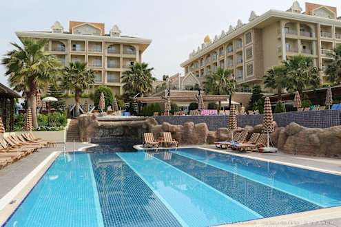 Außenansicht der beiden Adalya-Hotels vom Pool aus
