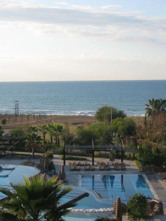 Vom Zimmer Ausblick auf Poolanlage und Meer