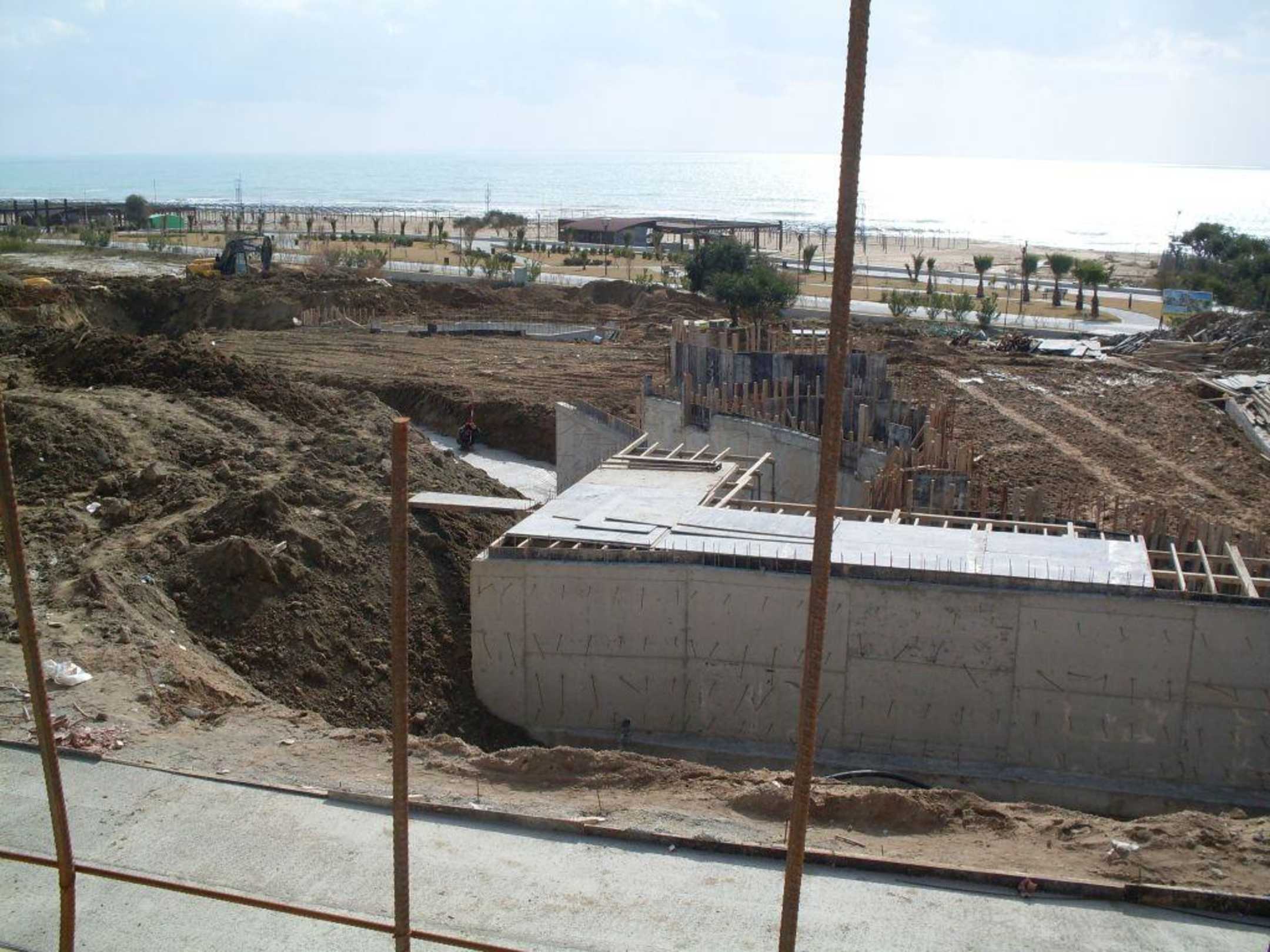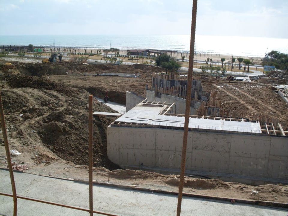Blick über die Poolbaustelle zum Strand