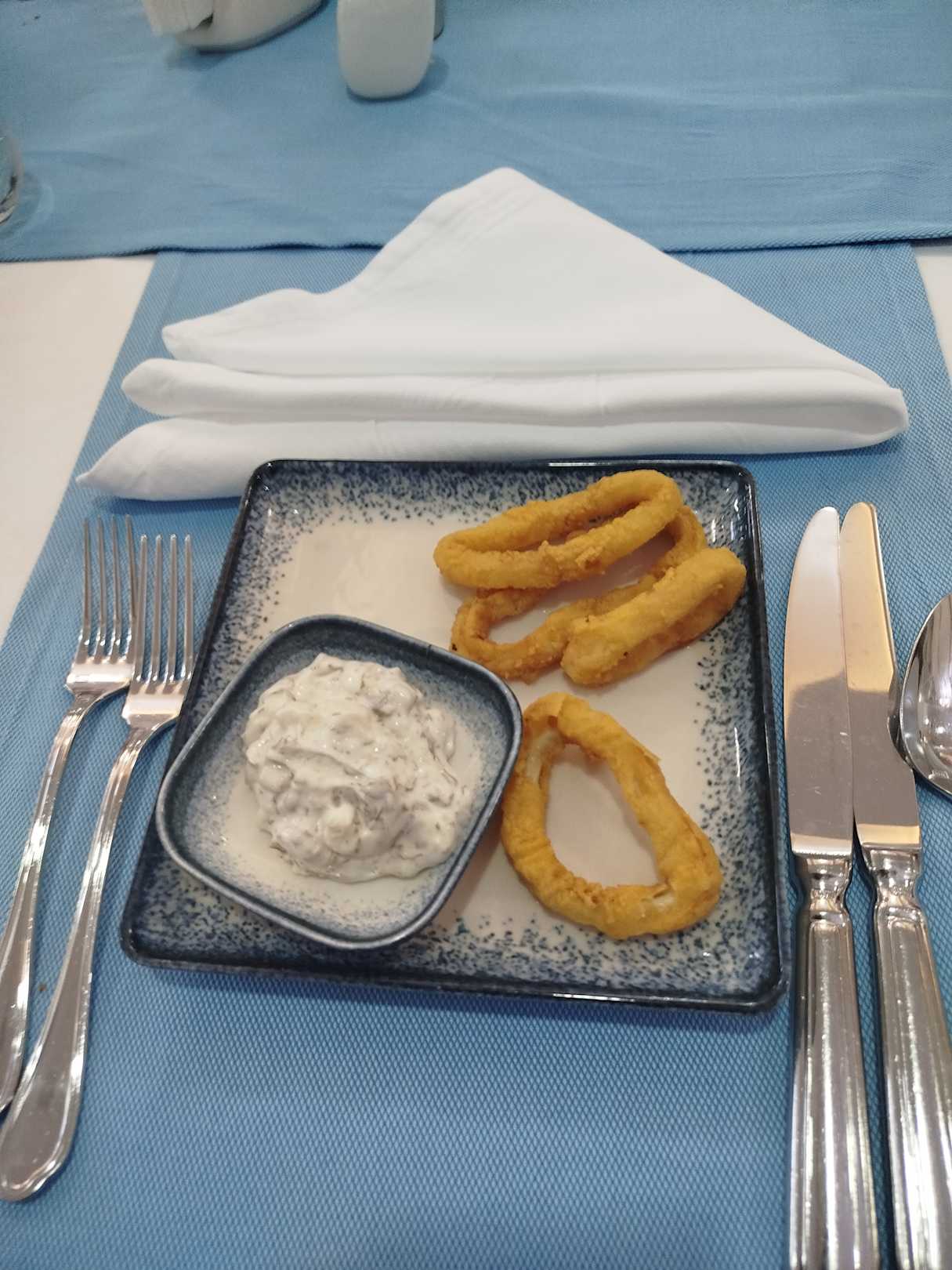 Warme Vorspeise (Tintenfischringe) beim Fischrestaurant