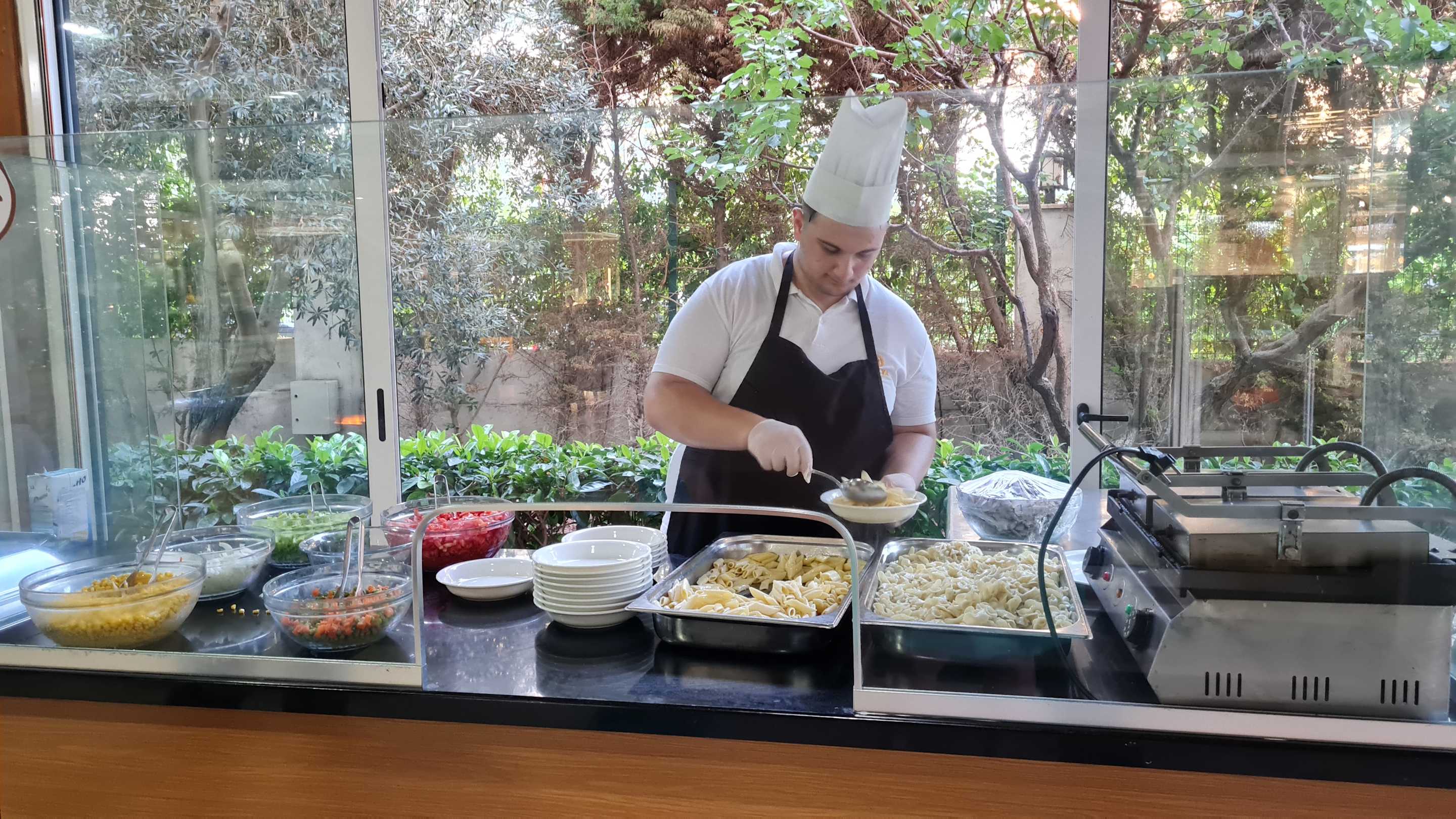 fresh-Cooking-Station (hier Abends) außen neben dem Hauptrestaurant.