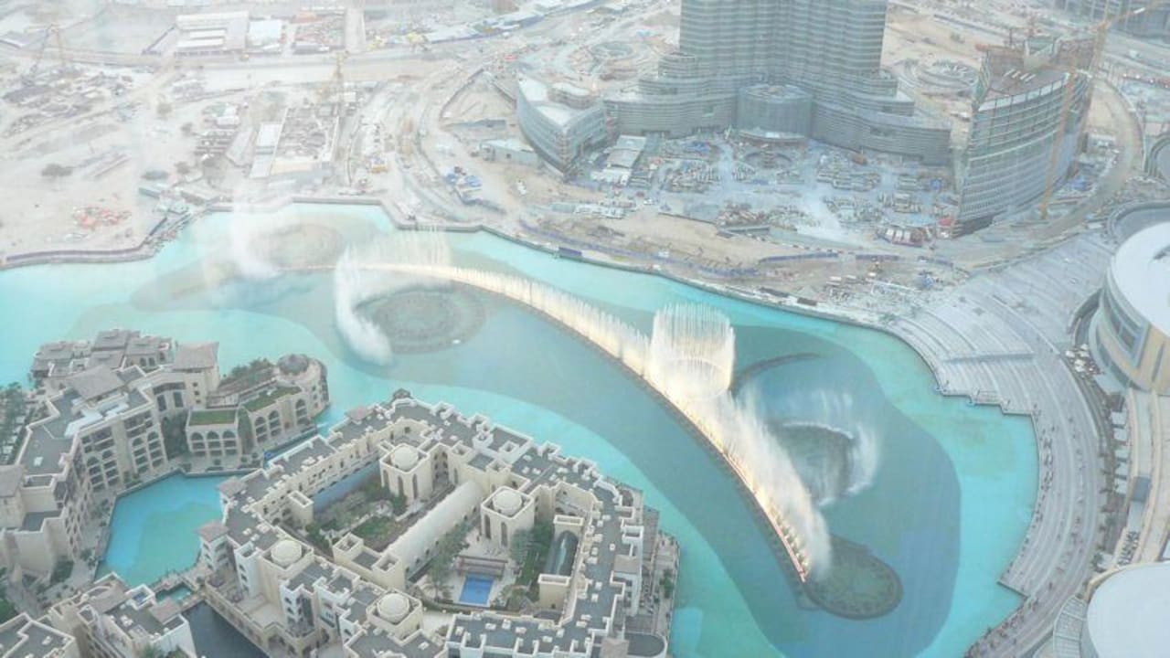 The Address Hotel - Ausblick aus der BarBlick aus dem 63. Stock aus der Bar Neos auf die Fontainen im Lake Dubai.