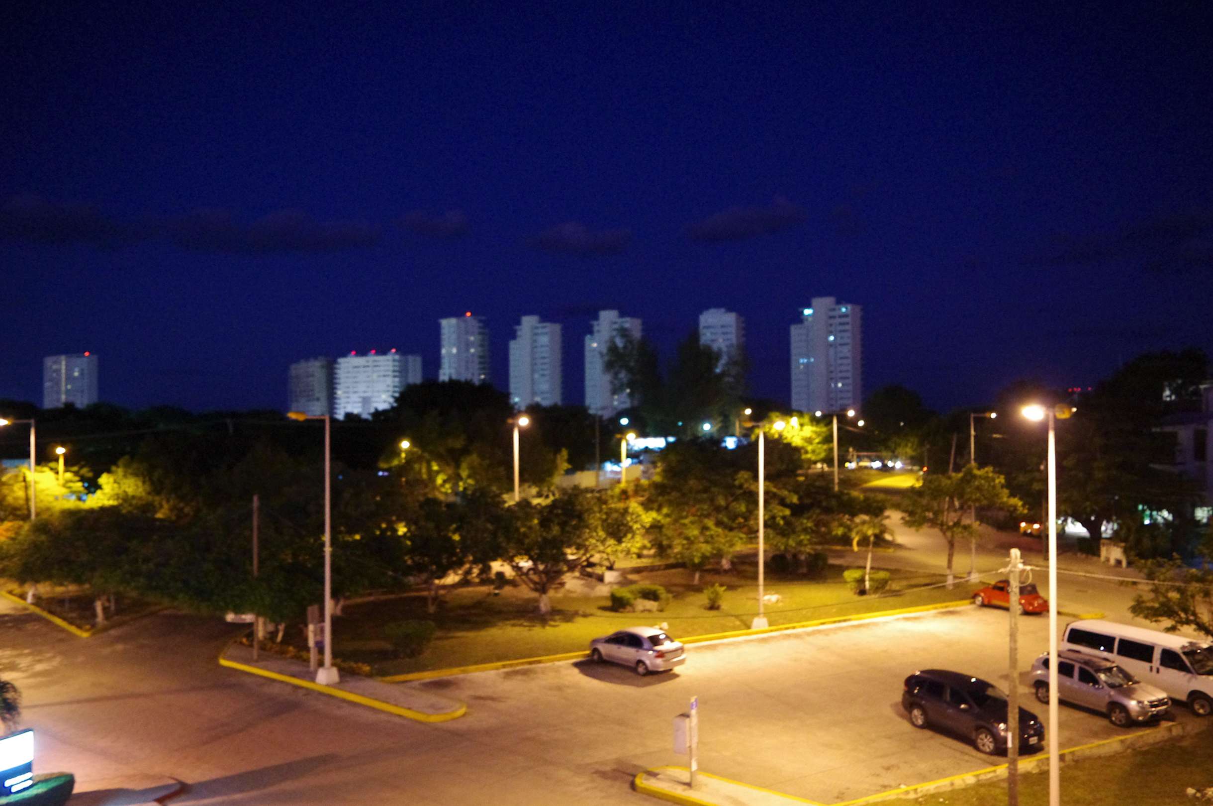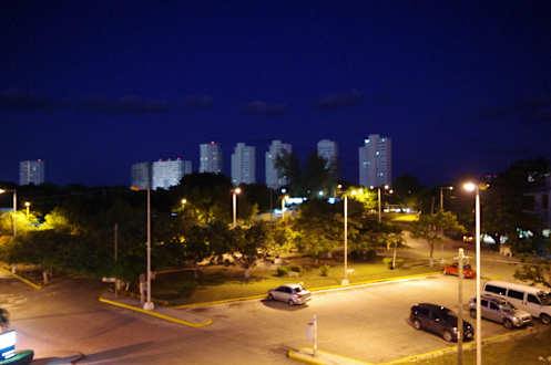Zur StraßenseiteDie Zimmertür ging von einem offenen Flur ab, vor dort der Blick auf die Skyline von Cancun