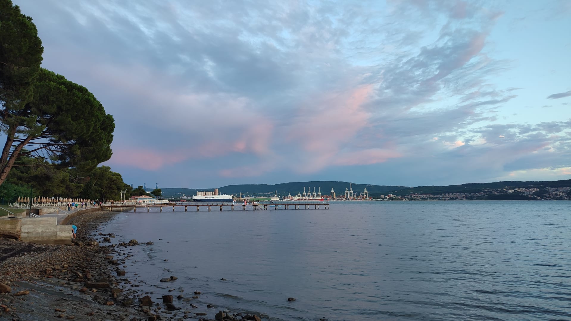 StrandHotelstrand mit Steg, im Hintergrund Hafen. Der Hotelstrand geht die gesamte Küstenfront entlang, geht fließend in den Campingplatz über.