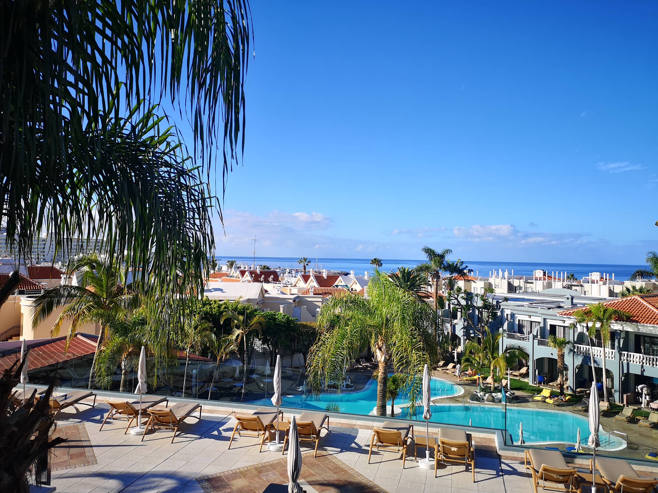 Blick auf die Poolanlage unten und eine der Terrassen im oberen Bereich