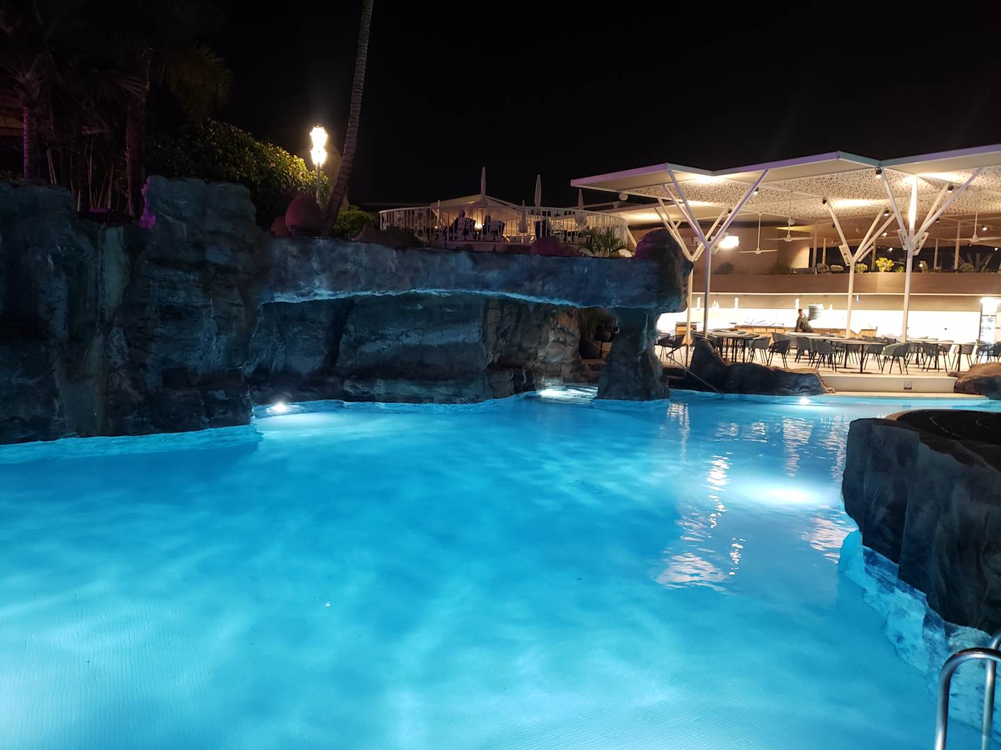 Blick vom Pool ins Außenrestaurant