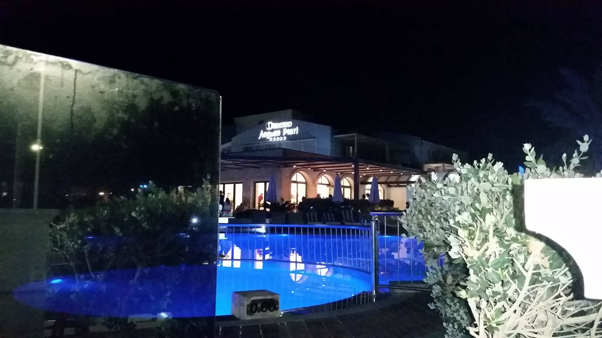 Pool und Empfangshalle bei Nacht