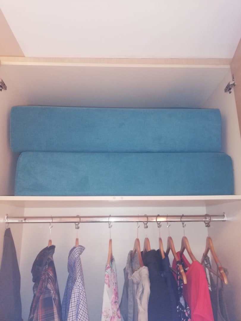 9 Bügel für 3 Personen, Ablage oben nicht nutzbar, da Polster verstaut sind