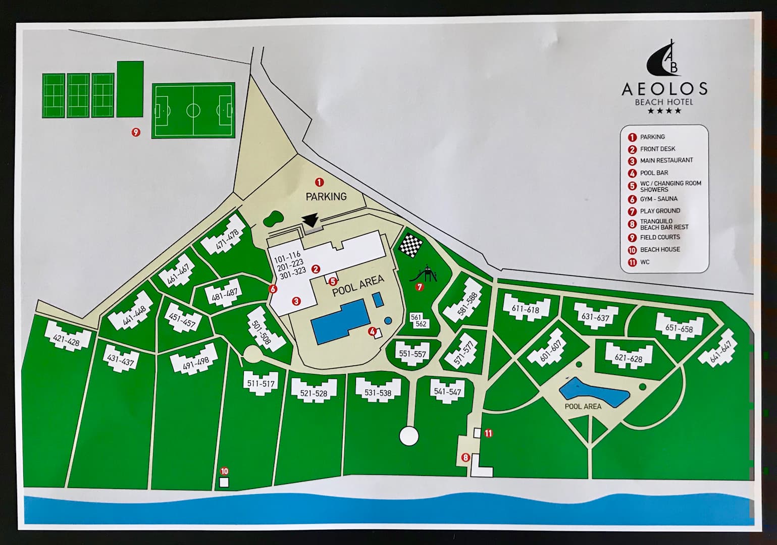 Übersicht über die komplette Anlage. Die bungalowartigen Wohnblocks mit 400er und 500er Zimmernummern sind alt, die 600er Zimmer rechts im Bild sind neu.