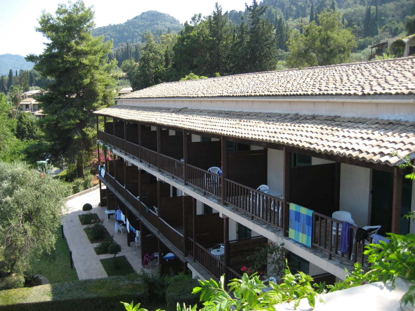 Haupthaus im LandhausstilBlick von der Lounge / Terrasse auf eines der Haupthäuser im Landhausstil, mein Zimmer auf der obersten Etage :-)