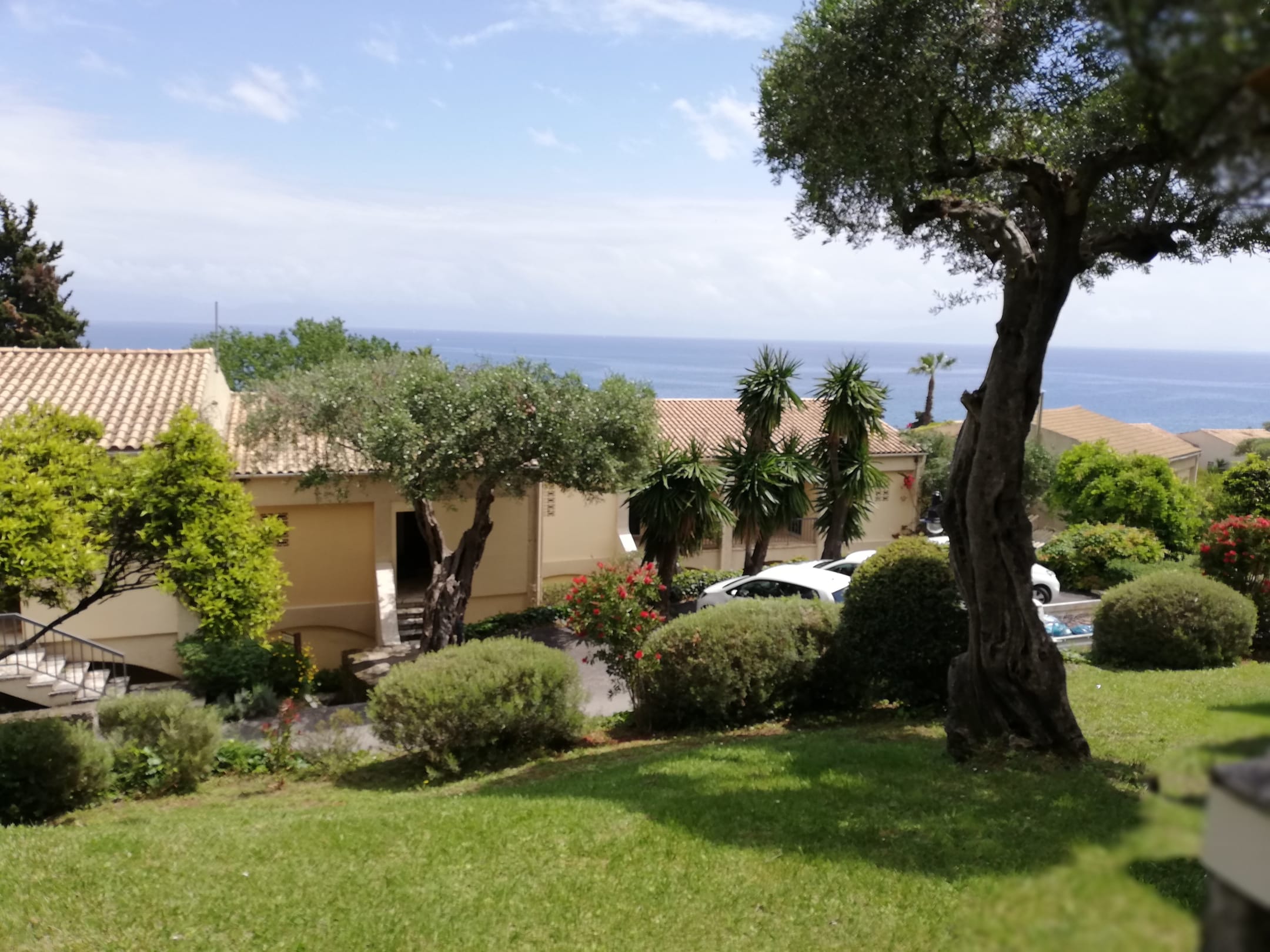 Gepflegte Gartenanlage am Hang, mit Meerblick, darin verteilt die Appartements