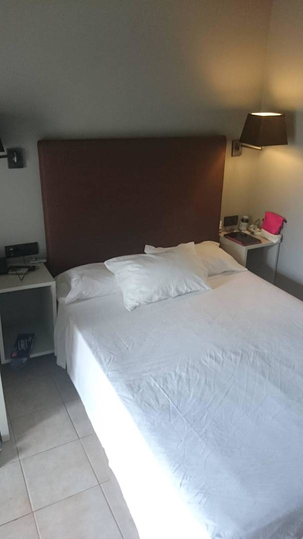 Bett in Zi. 3107, 1,40m breit. Neben dem Bett 35cm Platz bis zur Wand. Links, am unteren Rand ist die KAnte eines dritten, überflüssigen Bettes zu sehen