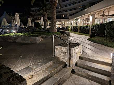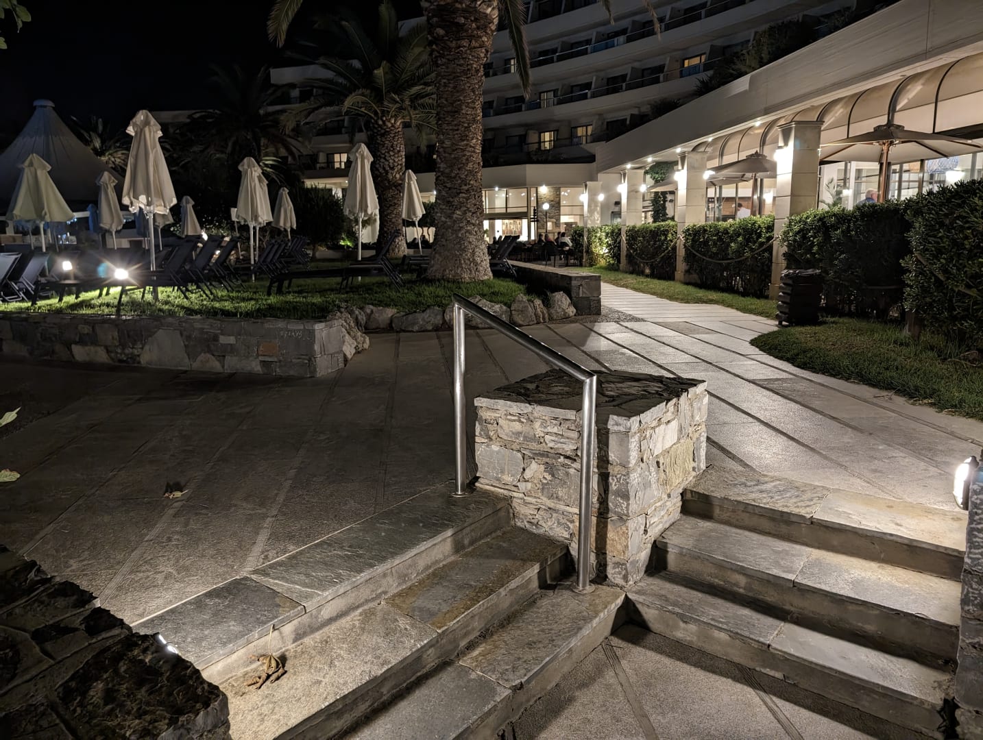 AußenansichtAußenbereich des Haupthaus im Bereich des Hauptrestaurant (rechts). Links liegt der Hauptpool und weiter hinten die Lobby Bar.