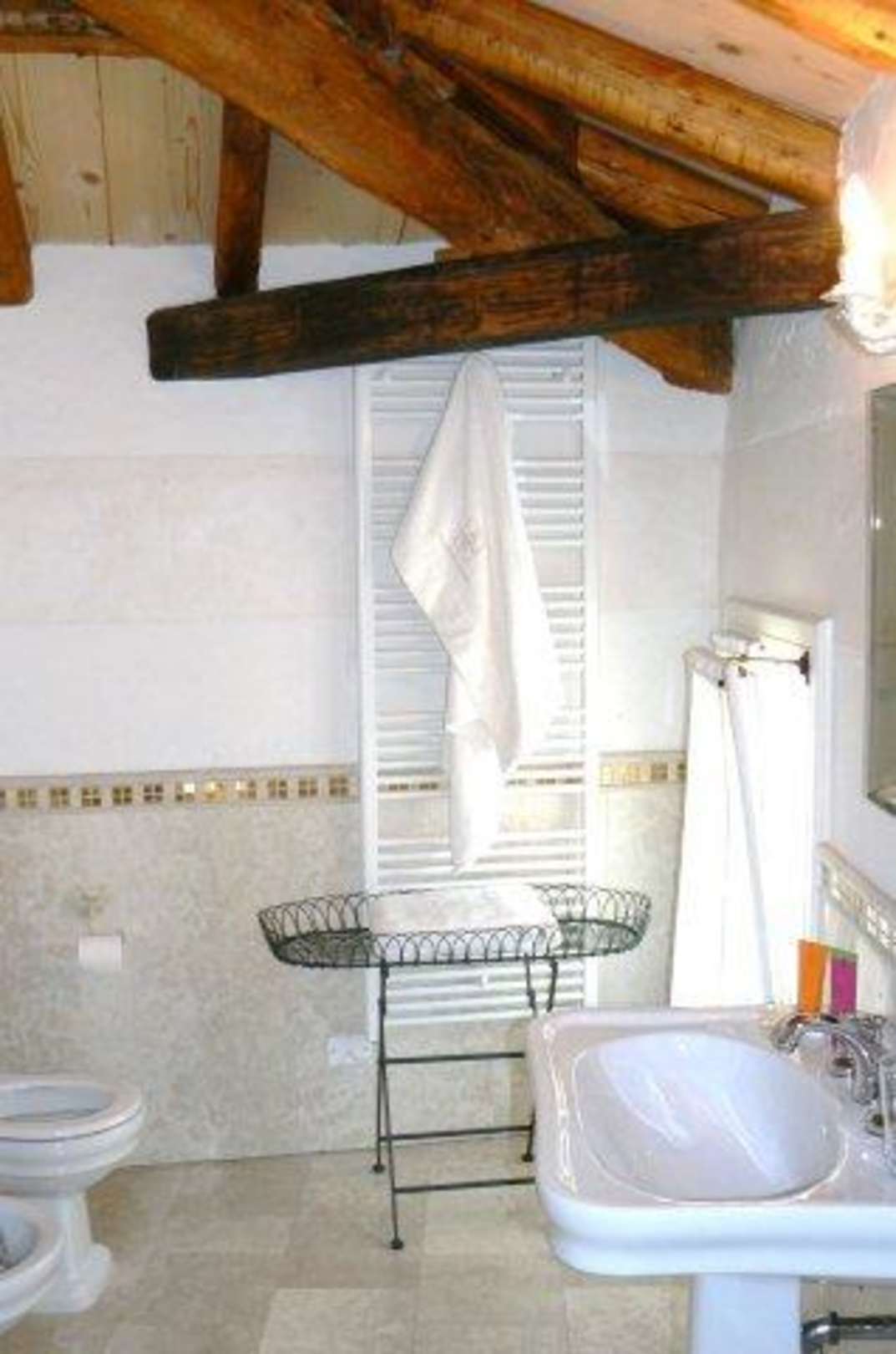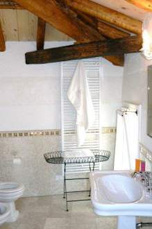 Das Bad im Eckzimmermodern eingerichtetes Bad, vorsichtig mit dem Kopf !! die alten Balken sind noch drin !!