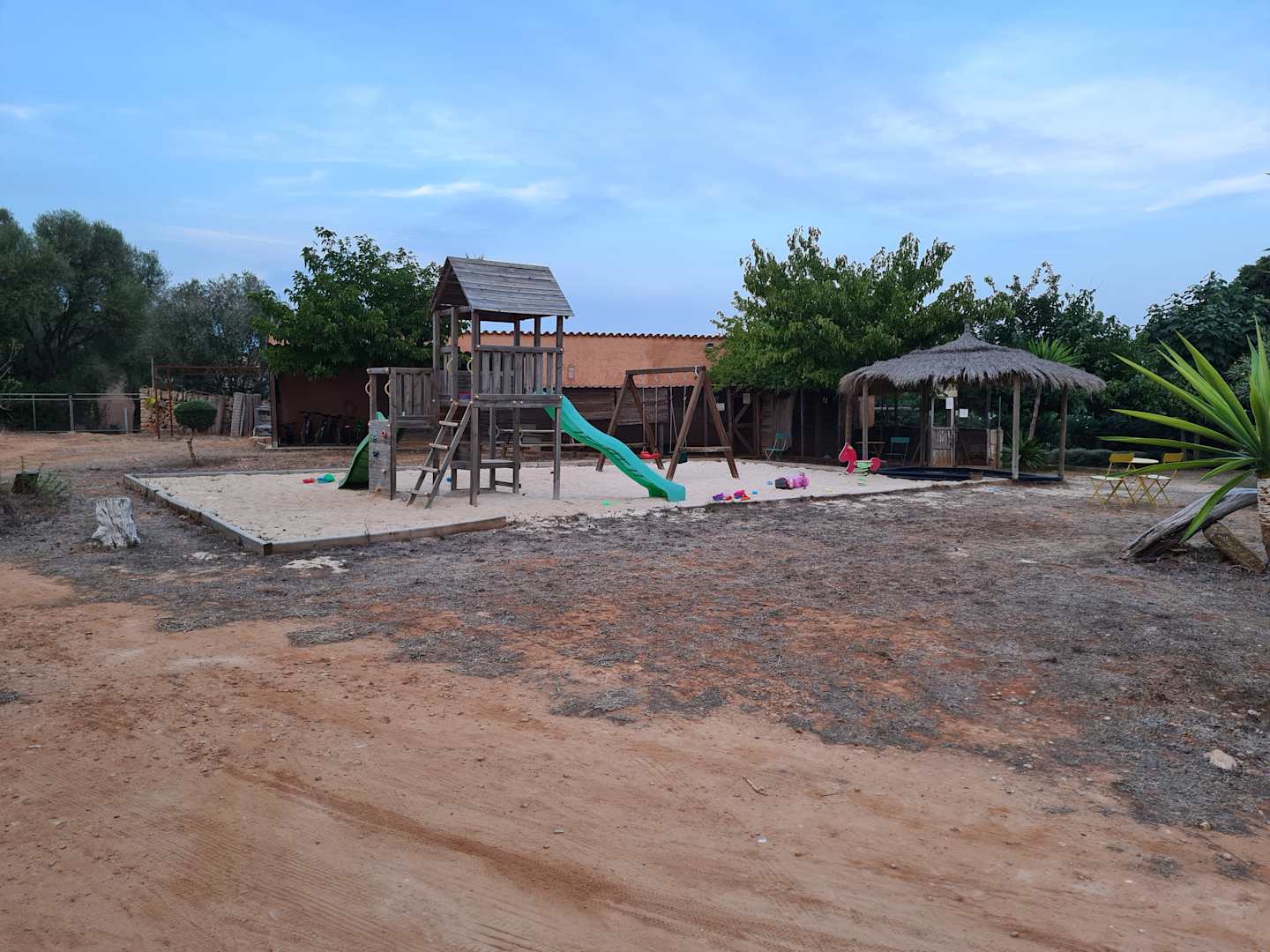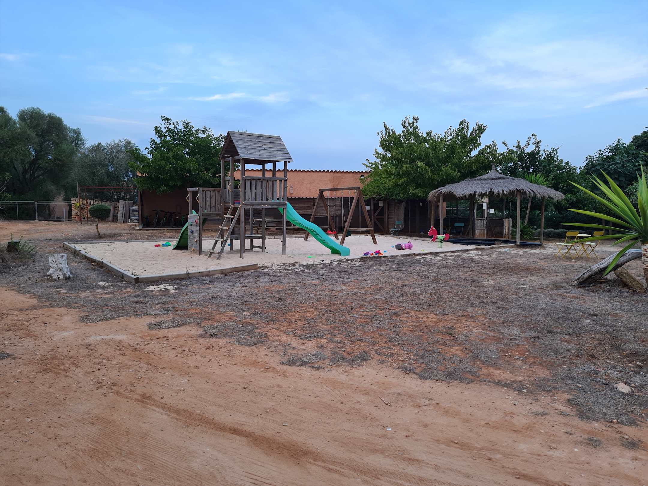 Spielplatz und dahinter der Stall für die Hühner und die Hasen