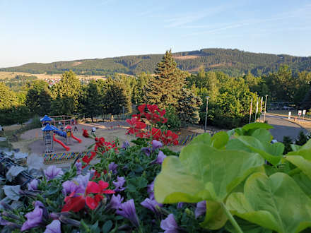 Ausblick zum Spielplatz, den Ziegen und Richtung Schwimmbad